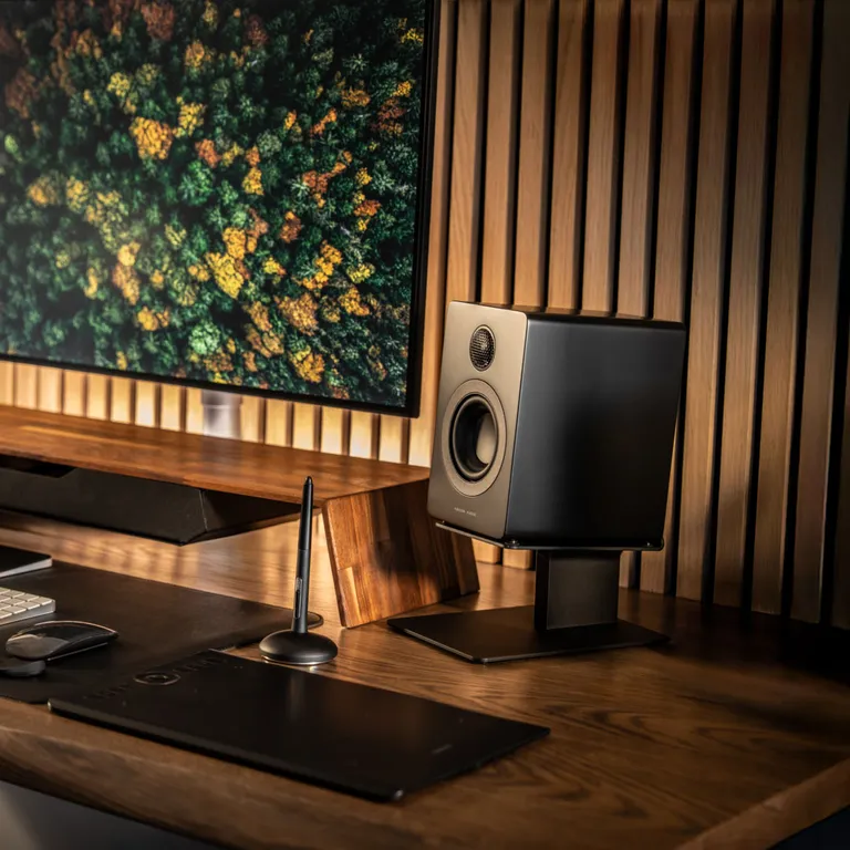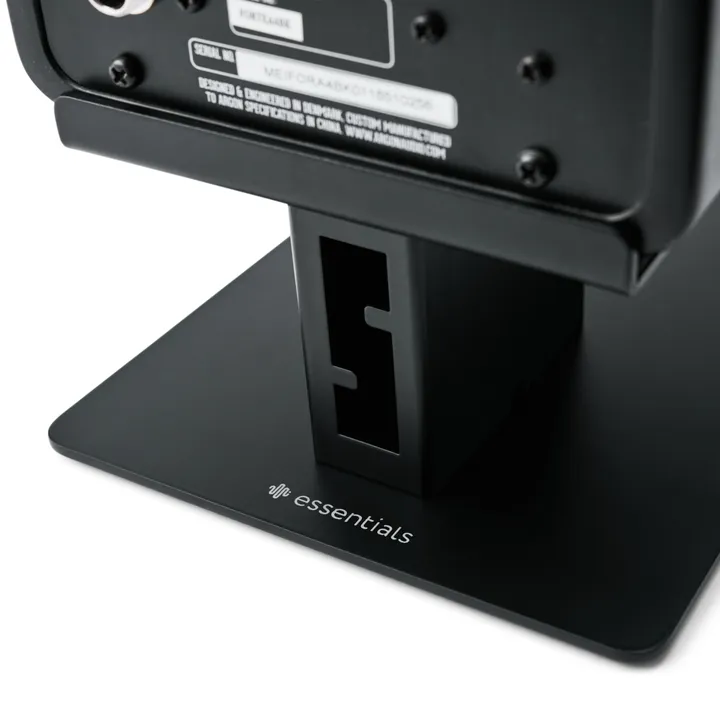 Essentials KONTUR 10 ist ein kompakter und stilvoller Tischständer für die optimale Platzierung von Computerlautsprechern auf einem normalen Schreibtisch. Der Ständer sorgt für einen passenden Winkel des Lautsprechers zur Hörposition, wodurch ein Großteil der unerwünschten Schallreflexionen von der Tischplatte vermieden wird. Als raffiniertes Detail ist die Oberseite mit vibrationsdämpfendem Schaumstoff ausgekleidet. Eine gute Wahl für ein Paar kompakter Aktivlautsprecher, zum Beispiel von Argon Audio.