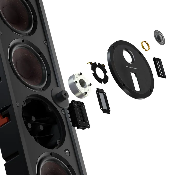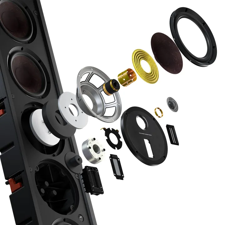 Die Hybrid-Hochtöner des Topmodells M-375 kombinieren die Vorzüge von Dome- und Bändchenprinzip und bieten eine hohe Belastbarkeit, eine breite horizontale Abstrahlung sowie eine seidenweiche, sehr luftige Höhenwiedergabe, die mit den besten Elektrostat-Konstruktionen mithalten kann. Das Hochtönermodul kann gedreht werden, um alle feinen Details bis in den Ecken des Raums zu liefern, unabhängig davon, ob Du den Lautsprecher vertikal oder horizontal an die Wand bringst.