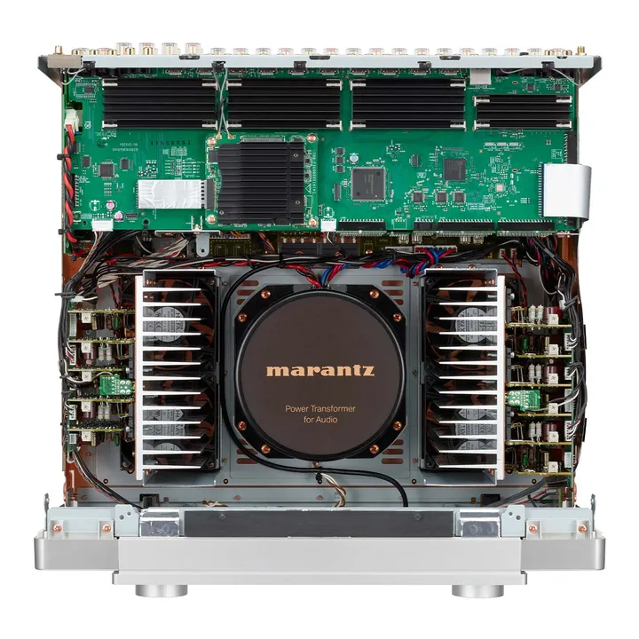 Der aufwändige Ringkerntransformator im CINEMA 30 wiegt fast sechs Kilo und ist von Natur aus viel leiser als die herkömmlichen Trafos, die in kleineren Marantz-Modellen und den meisten anderen Surround-Receivern auf dem Markt zu finden sind. Der Transformator ist zusätzlich von einer Metallabschirmung umgeben, so dass jegliche Abstrahlungen effektiv eliminiert werden.
