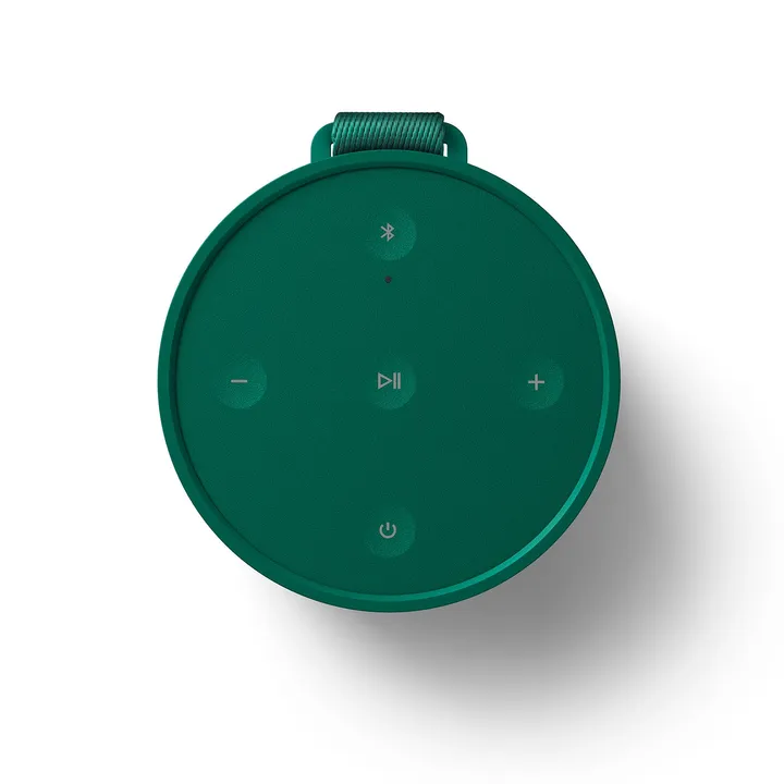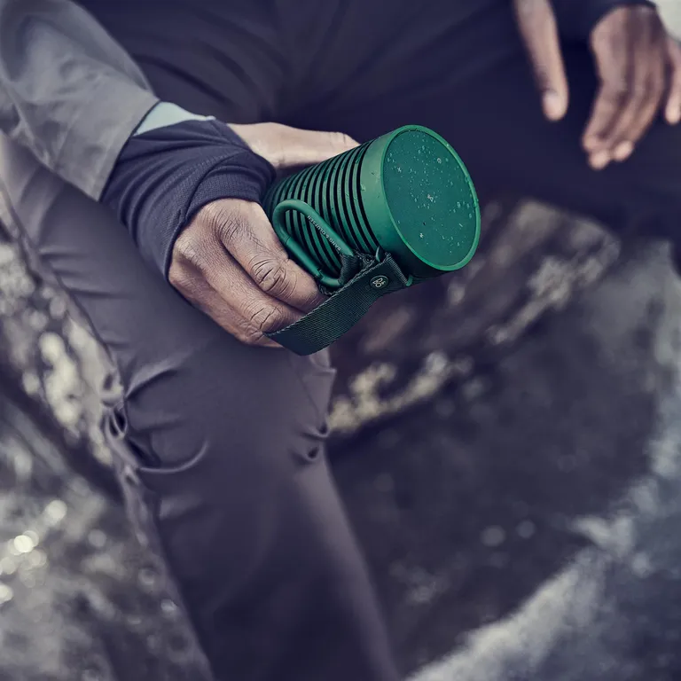 Über die leicht zugänglichen Drucktasten auf der Oberseite regelst Du die Lautstärke sowie Play und Pause, sodass Du nicht unbedingt zumTelefon greifen musst. Dank smartem Tragegurt ist es ein Vergnügen den Beosound Explore immer dabei zu haben. Mit dem mitgelieferten Karabiner befestigst Du den Lautsprecher ganz einfach an Rucksack oder Fahrrad und genießt unterwegs stundenlang Musik.