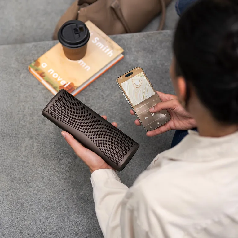 Muo ist elegant und solide aus Aluminium gestaltet, und es wird ein passender Trageriemen in derselben Farbe mitgeliefert. Der Lautsprecher ist wasserdicht (IP67) und übersteht problemlos Regenwetter und sogar einen Sturz in den Pool, falls du ihn versehentlich fallen lässt. Über die leicht zugänglichen Druckknöpfe kannst du die Lautstärke regeln und Play/Pause/Skip steuern, wenn du dein Handy gerade nicht zur Hand hast. In der dedizierten Connect-App von KEF kannst du den Klang anpassen, sodass du ihn genau so erhältst, wie du ihn möchtest.