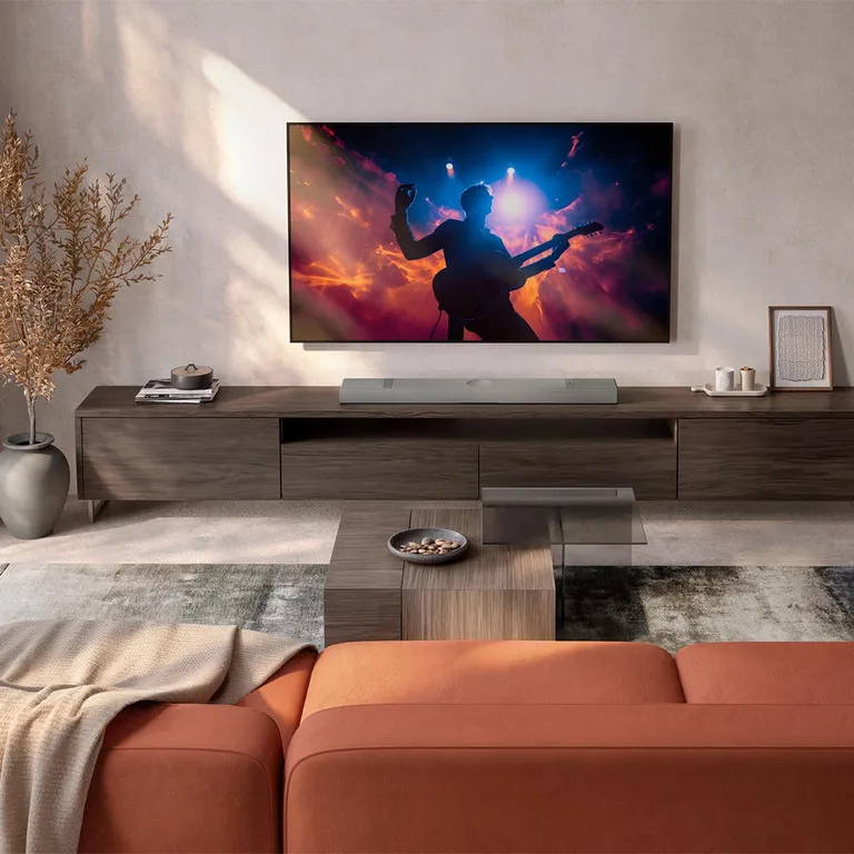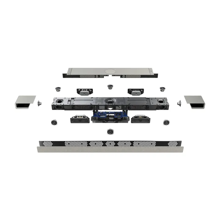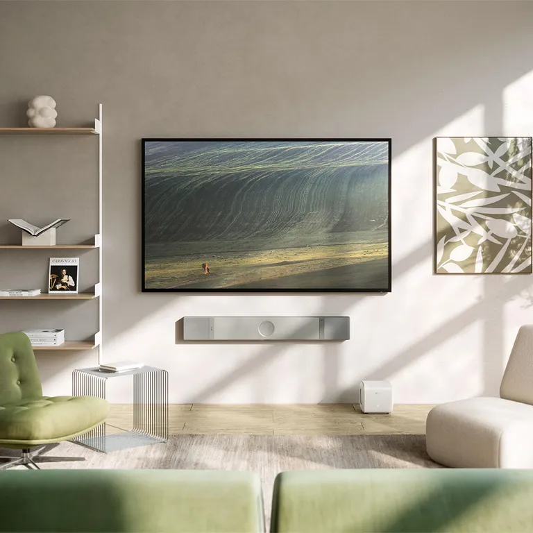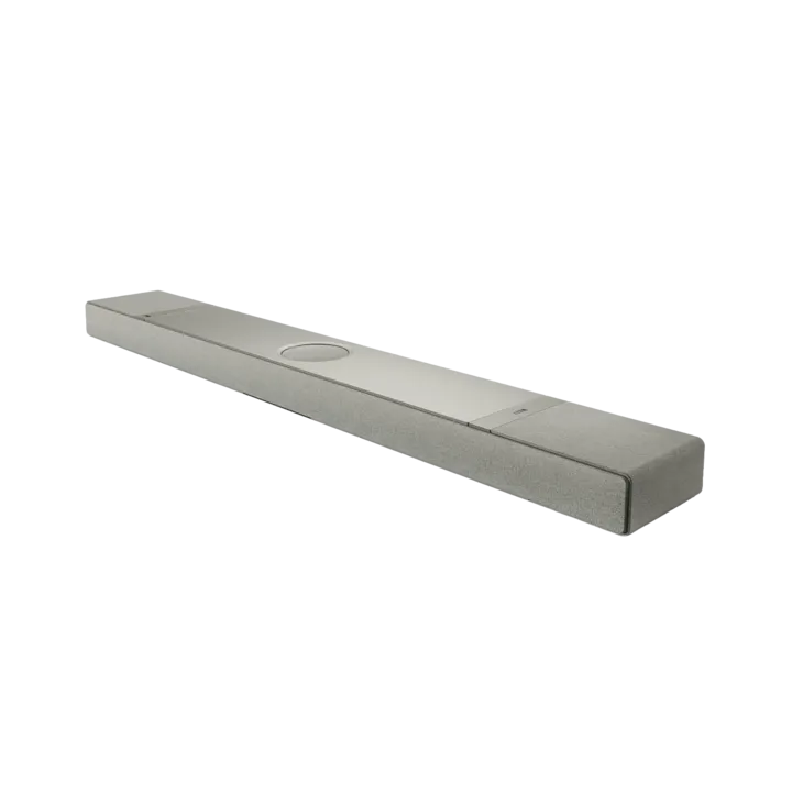XIO ist stolze 121 cm breit, wirkt dank ihres schlanken Designs aber dennoch erstaunlich kompakt und elegant – egal, ob an der Wand montiert oder waagrecht auf Deinem TV-Möbel platziert. Das Gehäuse besteht aus echtem Aluminium mit spritzwasserfestem Textil und rundet den Eindruck eines Produkts der Spitzenklasse perfekt ab.