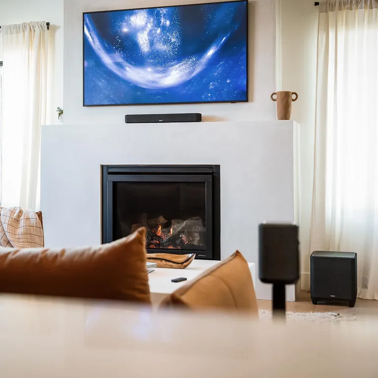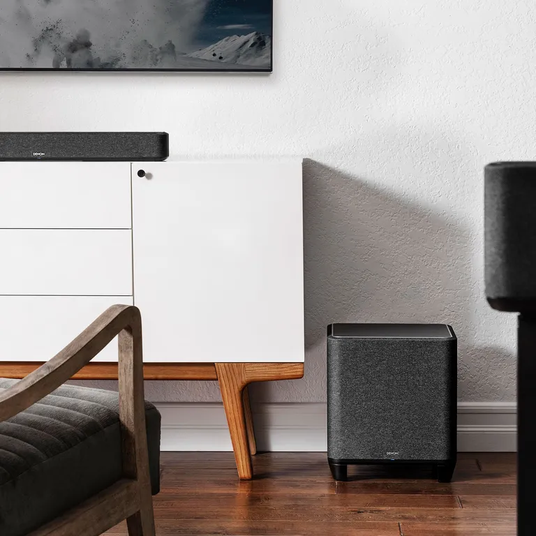 Mit dem Denon Home Subwoofer kannst Du Dein Heimkino schrittweise aufbauen, wenn Du nicht alles auf einmal angehen möchtest. Zunächst verwendest Du den Subwoofer z.B. mit der Denon Home Sound Bar 550 in einem gut klingenden 2.1-Kanal-Setup. Wenn Du magst und Dein Budget es zulässt, erweiterst Du das System mit zwei kabellosen Denon Home-Lautsprechern für die hinteren Kanäle, so dass Du ein vollständiges 5.1 Kanal Surround-Heimkino mit Klang von allen Seiten erhältst – mit einem absoluten Minimum an losen Lautsprechern, Kabeln und Umständen.