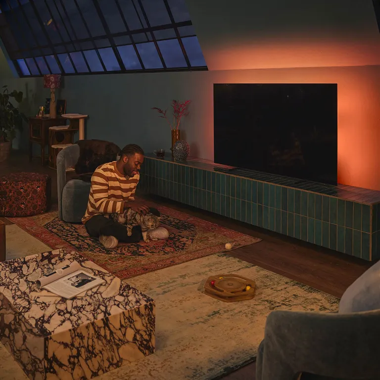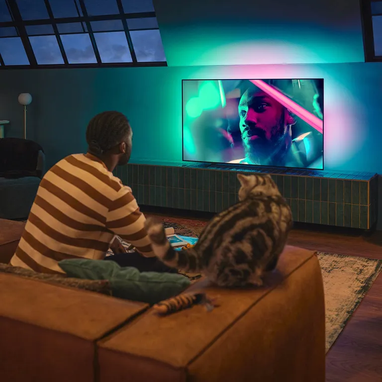 Das aufregende dreiseitige Ambilight-System, das mit LEDs an den Seiten des Fernsehers die Rückwand des Wohnzimmers in tollen Farben beleuchtet, die zum Geschehen auf dem Bildschirm passen, ist ein echtes Erlebnis. Wenn Du Deinen Fernseher nahe der Wand aufstellst, kannst Du Dich buchstäblich auf ein neues Fernseherlebnis freuen, denn Bildschirm und Ambilight ziehen Dich in die Atmosphäre mit ein. Wenn Du das reine Fernsehbild bevorzugst, kannst Du die Funktion auf dezentes Weißlicht einstellen oder Ambilight ganz ausschalten.