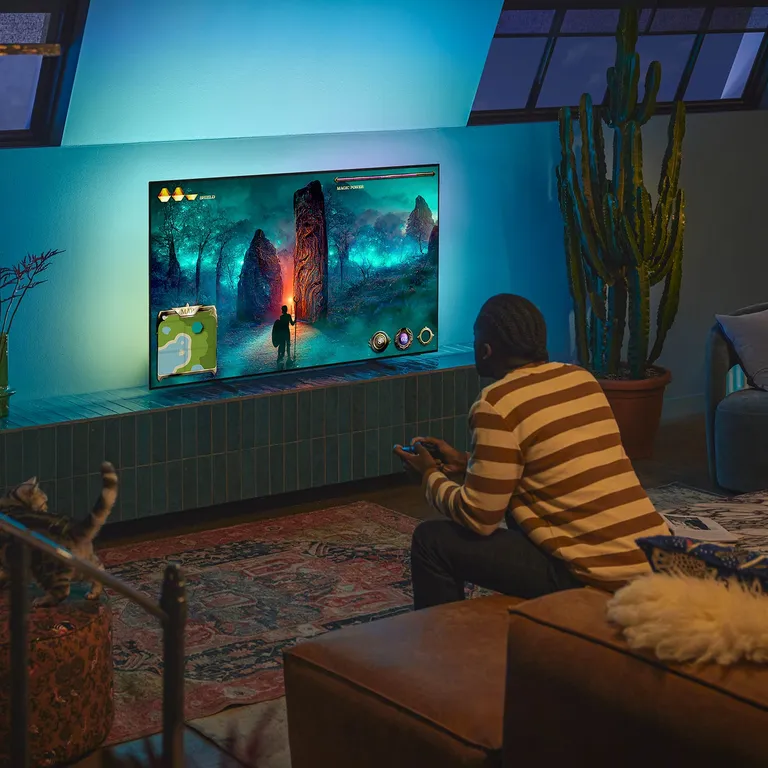 Beim Philips QLED708 bekommst Du die beste Version des Philips Game Mode, einschließlich der HDMI 2.1-Funktionen VRR (Variable Refresh Rate), ALLM (Automatic Low Latency Mode), HFR (High Frame Rate, 4K/120) und G-SYNC. Mit der Philips Game Bar bekommst Du außerdem ein On Screen Menü, das ausschließlich dem Gaming gewidmet ist.