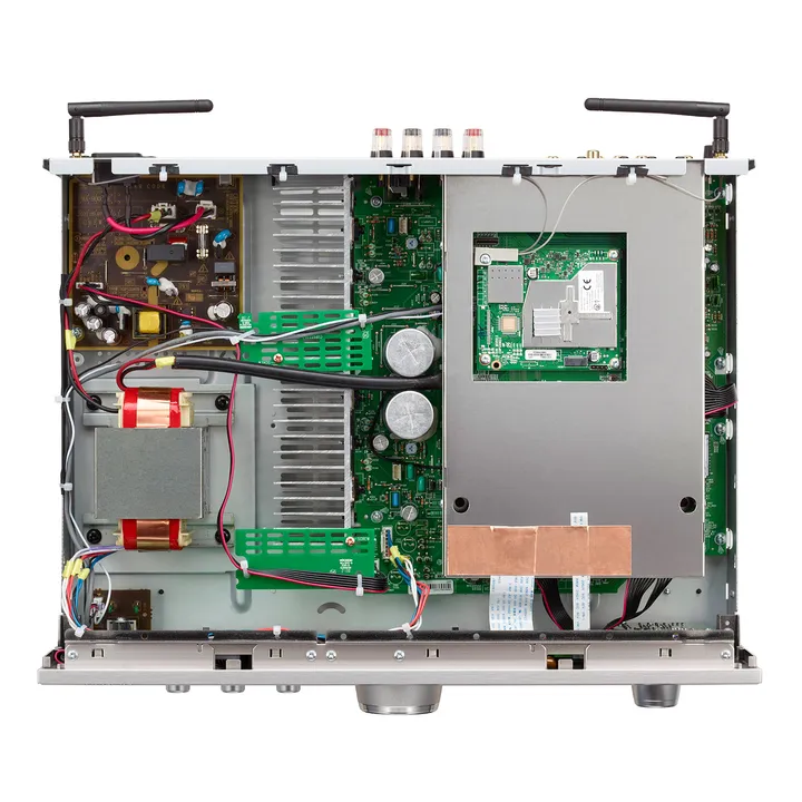 Der mechanische Aufbau ist schwer und stabil, um klangverschlechternde Vibrationen zu vermeiden. Die Stromversorgung für die empfindlichen Audioschaltungen ist von den Enden der Steuerschaltungen getrennt, um Interferenzen zu verhindern. Der eingebaute Signalprozessor schaltet sich automatisch ab, wenn er nicht für die Musikwiedergabe benötigt wird (Stop-Modus), und bei der Wiedergabe von analogen Musikquellen kannst Du alle digitalen Schaltkreise komplett abschalten. Dadurch wird das Risiko von abgestrahltem Hochfrequenzrauschen vermieden (Analog Modus).