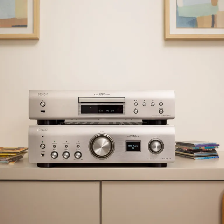Um das Ganze abzurunden, ist die Front des Denon PMA-900HNE in Aluminium ausgeführt, so dass die Optik mit der klanglichen Leistung einher geht. Wenn Du weiterhin gerne Deine CD-Sammlung hörst, dann ist der DCD-900NE CD-Player von Denon hier die perfekte Ergänzung – in Design und Funktion. Mit dieser Kombination bekommst Du alle Vorteile einer herkömmlichen Stereoanlage – und eine Fülle großartiger kabelloser Optionen on top.