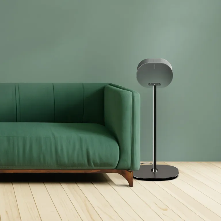 Der Floor Stand für Sonos Era 300 ist schlank designt und hat eine schwere und stabile Basis, sodass er sicher auf dem Boden steht. Er ist schnell und einfach zu montieren, und du kannst das Stromkabel und ein eventuelles Netzwerkkabel diskret entlang der eleganten Metallsäule zum Lautsprecher führen.