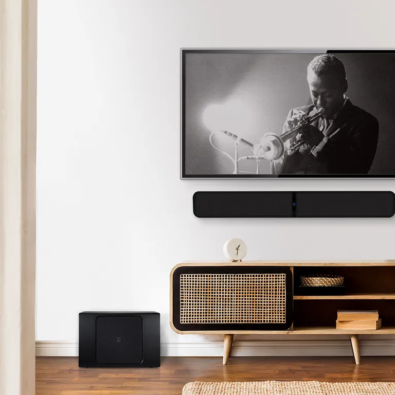 Der PULSE SUB+ ist für einen Subwoofer außergewöhnlich kompakt und dank seines flachen Designs besonders flexibel aufstellbar – zum Beispiel liegend unter einem Sofa oder hängend an der Wand (Wandhalterung im Lieferumfang enthalten).