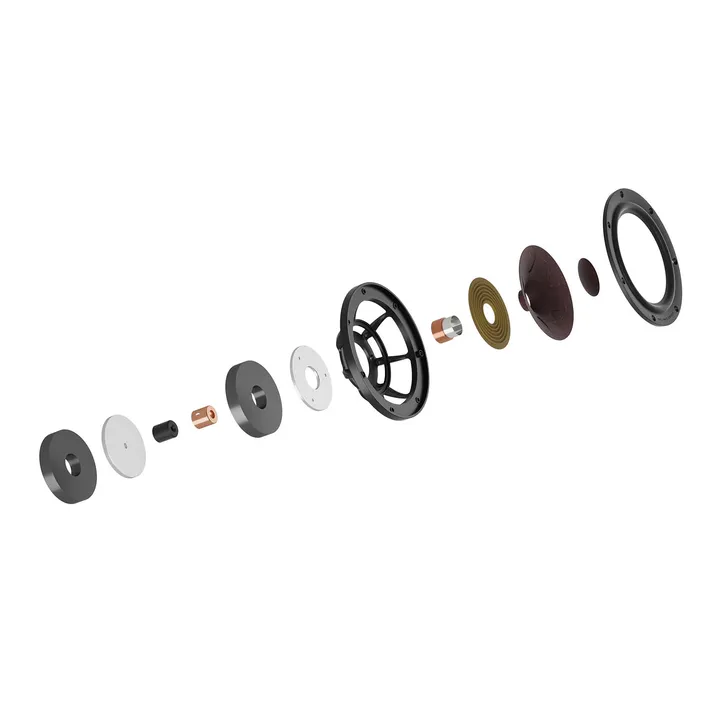 Bei RUBIKORE hat DALI das SMC-Polstück in eine sehr genau kalibrierte Kupferhülle eingekapselt und dann mit einem sehr leistungsstarken doppelten Ferritmagnetsystem umgeben. Ein einfaches und geniales Design, das in vielerlei Hinsicht fast so linear ist wie bei der teuren EPICON Version. Wenn Du die kristallklare Wiedergabe von Stimmen und Instrumenten von RUBIKORE hörst, wird deutlich, mit wie viel Verzerrung andere Konstruktionen im Tief-/Mitteltonbereich zu kämpfen haben.