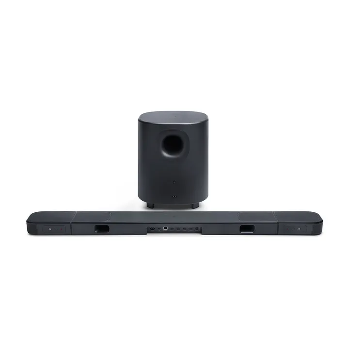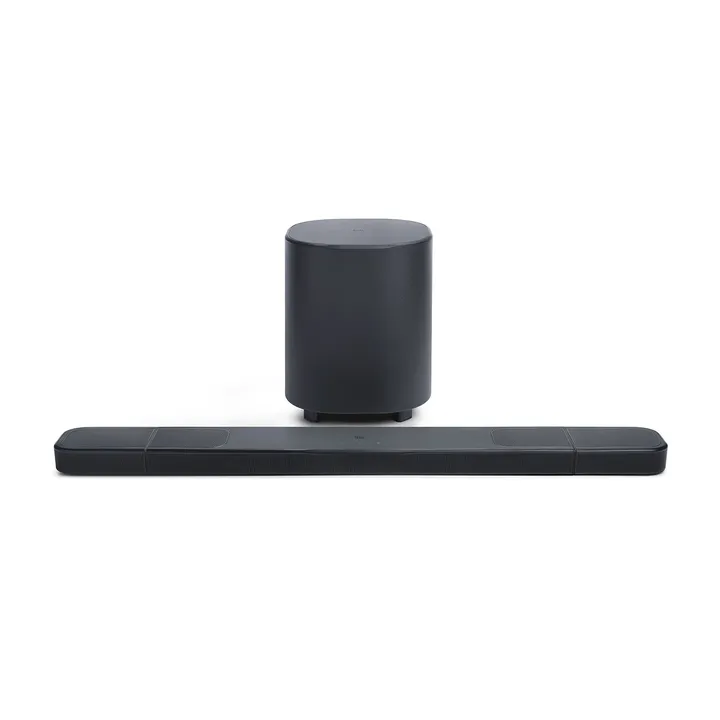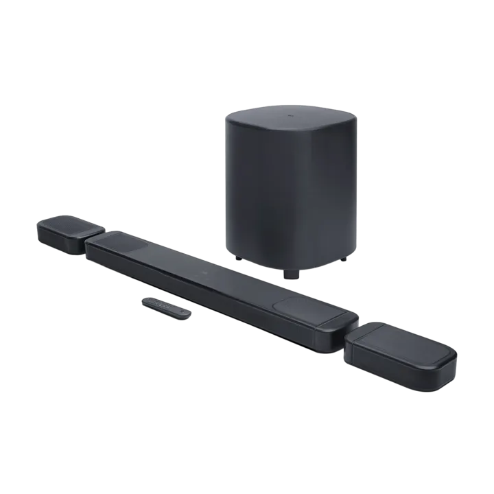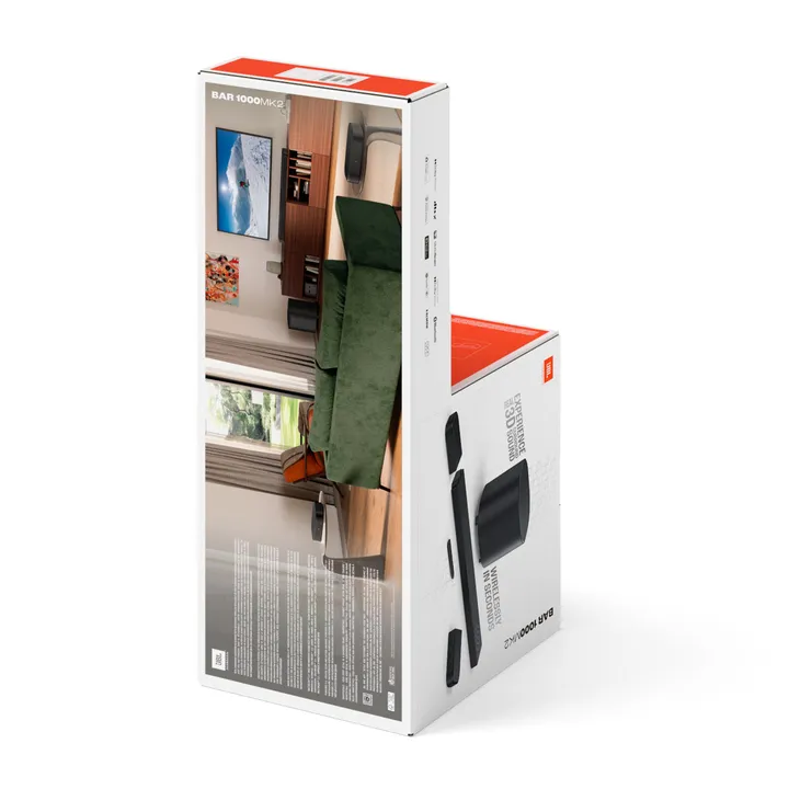 Die JBL BAR 1000MK2 ist in schwarzer Ausführung erhältlich. Kabelloser Subwoofer, kabellose Rücklautsprecher und Wandhalterungen für Soundbar und Surround-Lautsprecher sind im Lieferumfang enthalten.