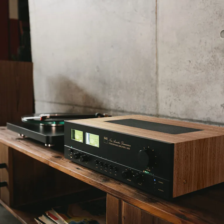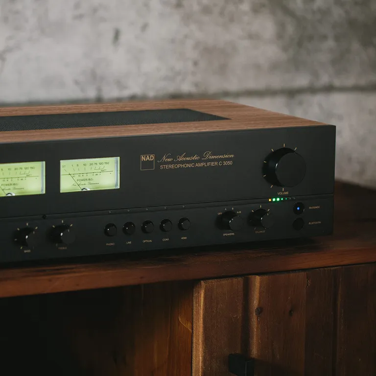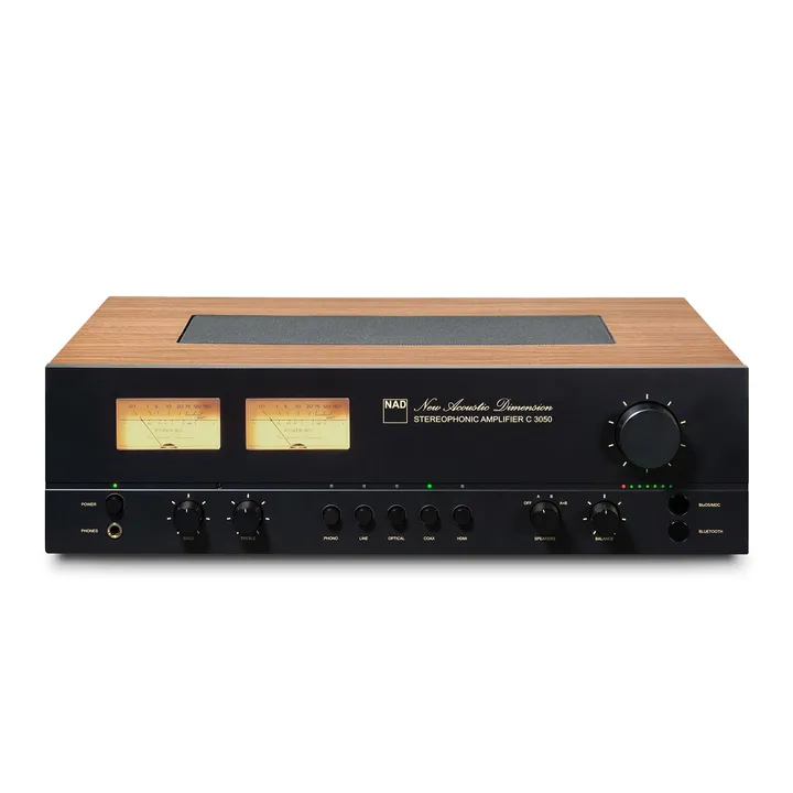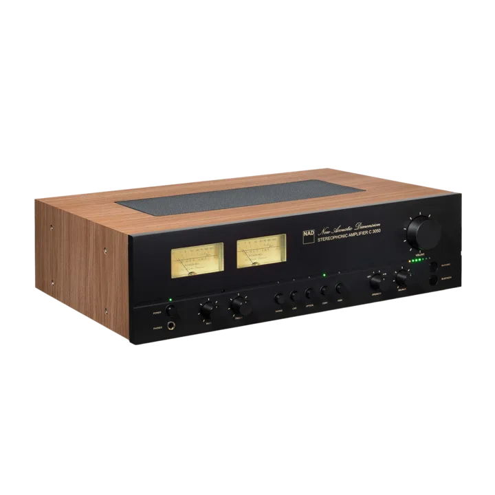Der NAD C 3050 ist ein audiophiler Stereoverstärker, der anlässlich des 50-jährigen Jubiläums der Gründung von NAD im Jahr 1972 entwickelt wurde. Das Design ist eine Hommage an das klassische 3030-Modell aus den 70er Jahren. Zu den Retro-Details gehören ein Gehäuse in Walnussoptik, traditionelle VU-Meter rechts und links, Drucktasten für die Eingangswahl und der NAD Original-Schriftzug "New Acoustic Dimension" in schön geschwungenen Schrift an der Front.