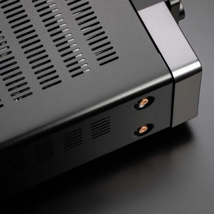 STEREO 70s ist ein wunderschönes Stück Industriekunst, das zu einem visuell aufregenden Element in Deinem Wohnzimmer werden kann. Die schlichte und elegante Front wird von dem goldenen Marantz-Logo und dem großen OLED-Display dominiert. Alles strahlt eine selbstbewusste Eleganz aus, wie es sich für ein Produkt dieses Kalibers gehört.