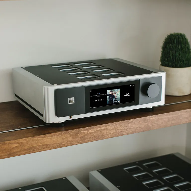 NAD M66 ist in silberner Aluminiumausführung erhältlich. Systemfernbedienung im Lieferumfang enthalten. Eine IR-Fernbedienung für Bluesound ist optional erhältlich.