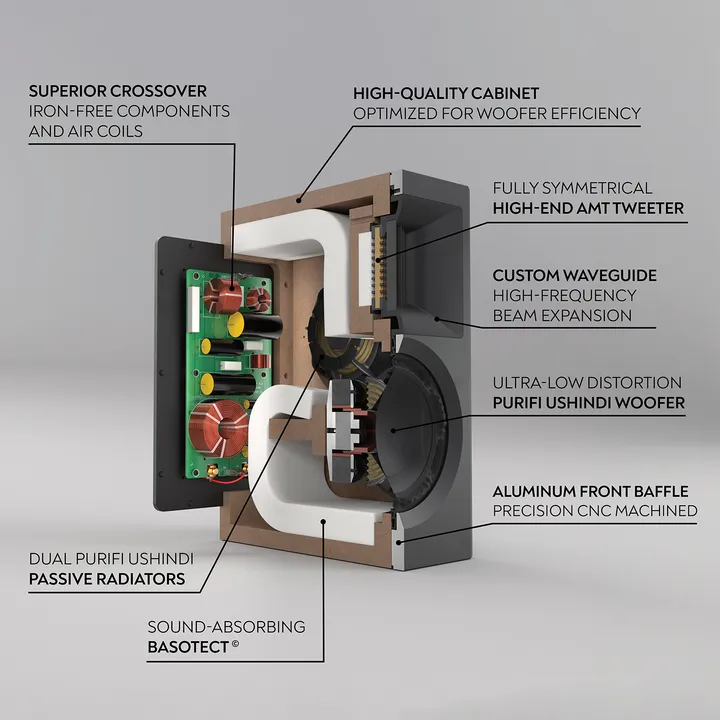 Die beiden 6,5“ USHINDI Slave-Einheiten (Passive Radiatoren) an der Seite des Lautsprechers ersetzen das traditionelle Bassreflexrohr und tragen dazu bei, den Tonbereich nach unten zu erweitern. Sie verdreifachen die Gesamtmembranfläche und verfügen über das gleiche raffinierte Langhubdesign wie die Haupteinheit, um mühelos sehr große Membranausschläge zu bewältigen. Eine exklusive und teure Lösung, die Verzerrungen und Anschlussgeräusche eliminiert, die mit einem Reflexrohr einhergehen. Aber wenn Du das Ergebnis hörst, wirst Du keinen Zweifel daran haben, dass es jeden Cent wert ist.
