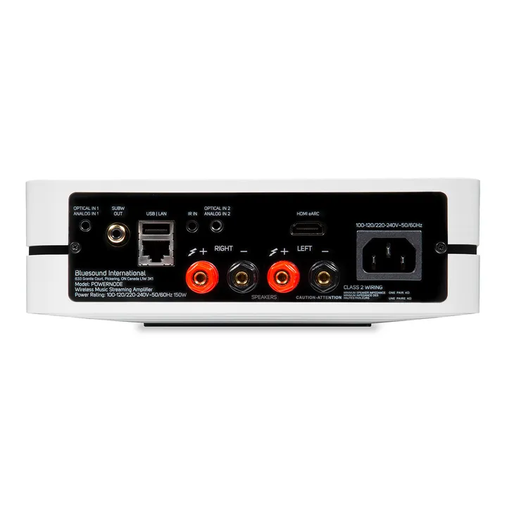 Bluesound POWERNODE (N330) ist in Schwarz oder Weiß erhältlich. Optional ist eine IR-Fernbedienung erhältlich.