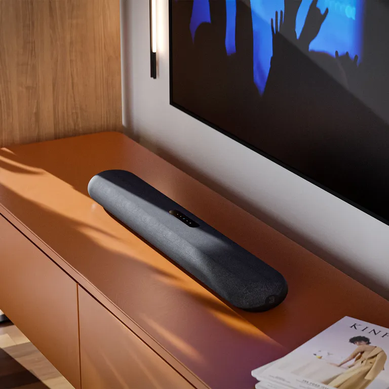 PULSE CINEMA MINI ist solide und elegant aus textilbespanntem Aluminium gefertigt, was den exklusiven Eindruck zusätzlich unterstreicht. Diese Soundbar wird eine stilvolle Ergänzung für Dein Wohnumfeld sein – egal ob Du sie auf ein Regal unter dem TV legst oder mit der mitgelieferten Halterung an der Wand montierst. Der Klang wird selbstverständlich automatisch an die gewählte Platzierung angepasst.